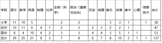 本次招聘靖西市外國(guó)語(yǔ)學(xué)校教師137名,其中小學(xué)崗位教師38名,初中崗位教師47名,高中崗位教師52名。崗位需求分布如下: