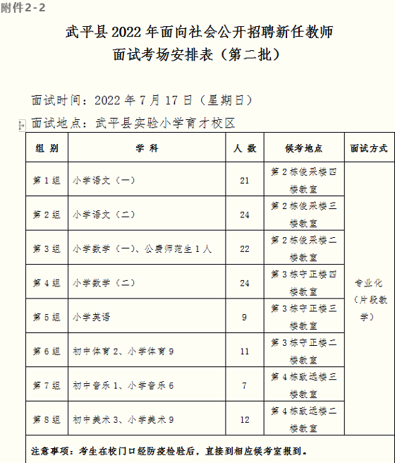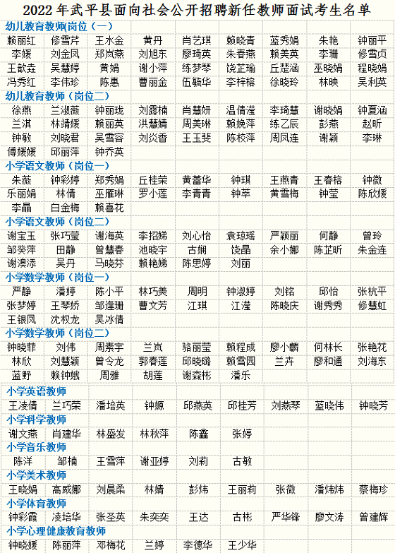 根據(jù)武平縣教育局、武平縣人社局、中共武平縣委編辦《武平縣2022年公開招聘中小學幼兒園新任教師公告》(武教綜〔2022〕23號)精神,經(jīng)福建省教育考試院統(tǒng)一組織筆試、對符合加分條件對象專項審核等,現(xiàn)將本次公開招聘面試工作有關(guān)事項公告如下: