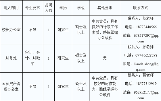 根據(jù)《廣西壯族自治區(qū)事業(yè)單位公開招聘人員實(shí)施辦法》(桂人社發(fā)〔2011〕155號)、《關(guān)于進(jìn)一步規(guī)范事業(yè)單位公開招聘崗位條件設(shè)置和資格審查有關(guān)問題的通知》(桂人社規(guī)〔2019〕8號)和《廣西壯族自治區(qū)人力資源和社會保障廳關(guān)于落實(shí)“放管服”改革精簡事業(yè)單位增人手續(xù)的通知》(桂人社規(guī)〔2018〕27號)等有關(guān)文件精神,結(jié)合實(shí)際工作需要,現(xiàn)將我校公開招聘行政教輔人員有關(guān)事項(xiàng)公告如下: