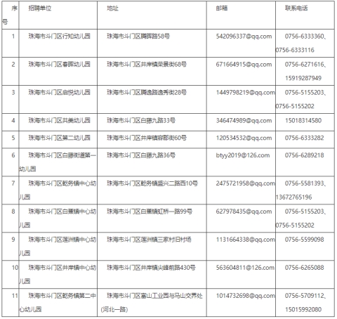 詳見《2022年秋季珠海市斗門區(qū)公開招聘公辦幼兒園合同制教職工一覽表》(附件1)。