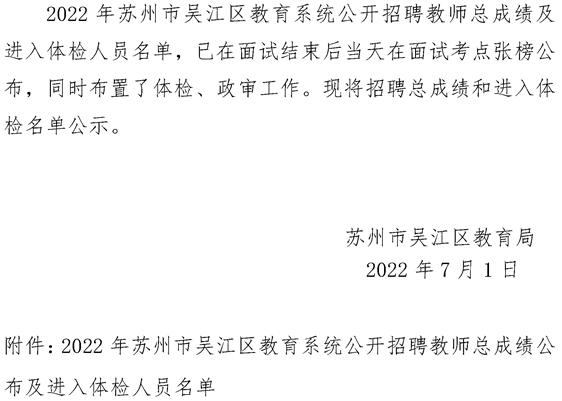 2022年江蘇蘇州市吳江區(qū)教育系統(tǒng)公開招聘教師總成績公布及進(jìn)入體檢人員名單