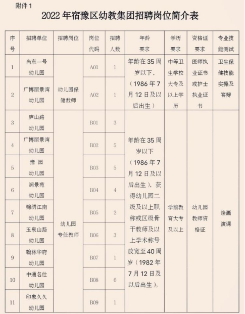 根據(jù)工作需要和相關(guān)規(guī)定,宿豫區(qū)幼教集團決定面向社會公開招聘幼兒園保健教師2名,專任教師30名,F(xiàn)將有關(guān)事項公告如下: