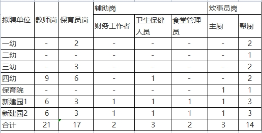 本次共招聘各公辦幼兒園教職工62人,其中教師21人,保育員17人,財(cái)務(wù)工作者2人,衛(wèi)生保健人員3人,食堂管理員2人,主廚3人,其他人員14人。