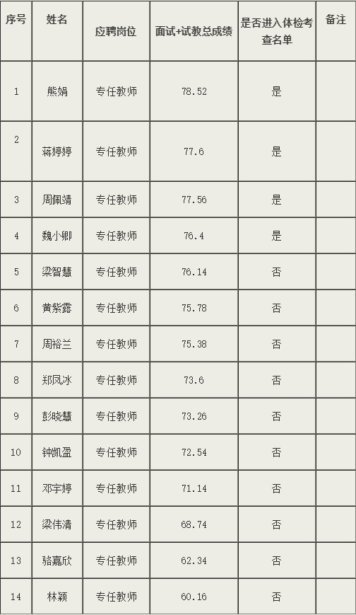 廣州市天河區(qū)華港幼兒園2022年7月編外聘用制專任教師考試工作已完成,現(xiàn)將成績(jī)以及體檢的名單予以公布,并將體檢有關(guān)事項(xiàng)公告如下: