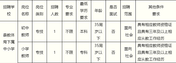 二、附件1中縣教體局下屬中小學(xué)“初中教師”和“小學(xué)教師”兩個崗位的“年齡”、“招聘范圍”、“其他條件要求”三欄調(diào)整后如下: