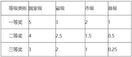 ①2020年9月以來被縣級(jí)及以上黨委、政府或教育主管部門評(píng)為優(yōu)秀教師、優(yōu)秀班主任、師德標(biāo)兵、優(yōu)秀黨員(優(yōu)秀黨務(wù)工作者)、優(yōu)秀教育工作者、最美鄉(xiāng)村教師的,按下表加分(同年度同類獎(jiǎng)項(xiàng)取最高獎(jiǎng)項(xiàng)加分,不累加)。