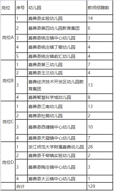 幼兒教師129名(分崗位A、崗位B、崗位C、崗位D),衛(wèi)生保健員14名、具體見下面兩表。