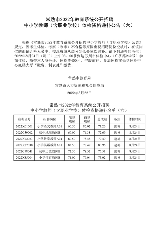 2022年蘇州常熟市教育系統(tǒng)公開招聘中小學(xué)教師(含職業(yè)學(xué)校)體檢資格遞補(bǔ)公告(六)
