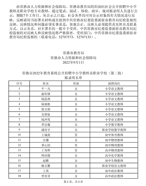 蘇州常熟市2022年教育系統(tǒng)公開招聘中小學(xué)教師及職業(yè)學(xué)校專業(yè)教師(第二批)擬錄用對(duì)象公示