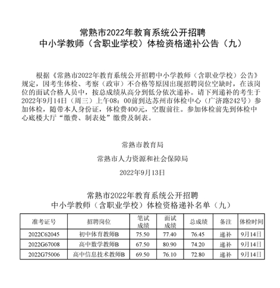 2022年蘇州常熟市教育系統(tǒng)公開(kāi)招聘中小學(xué)教師(含職業(yè)學(xué)校)體檢資格遞補(bǔ)公告(九)