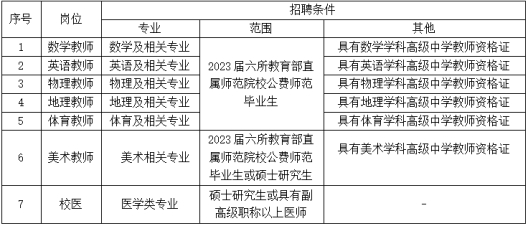 為進(jìn)一步優(yōu)化學(xué)校教師隊伍,提高教師隊伍整體素質(zhì),促進(jìn)教師隊伍的均衡發(fā)展,我校2022年將本著公正公開、寧缺毋濫、擇優(yōu)錄取的原則,面向2023屆六所教育部直屬師范院校公費師范生、碩士研究生及副高級以上職稱人員招聘教師和校醫(yī)。現(xiàn)將本次招聘報名相關(guān)事宜公告如下: