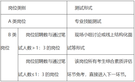 綜合素質評估主要采取專業(yè)技能測試、小組討論、結構化面試等形式對考生進行考察。各崗位具體考核形式見下表。
