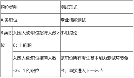 3.基本能力測試主要采取專業(yè)技能測試、小組討論等形式,對(duì)考生進(jìn)行考察。各職位具體考核形式見下表。