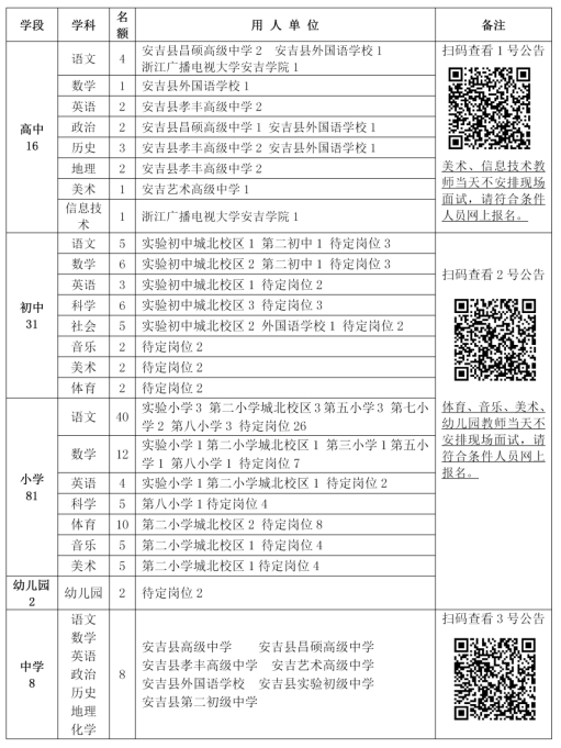 2.詳情請(qǐng)掃碼查詢《浙江省安吉縣招聘2023年教師公告(第1號(hào))》《浙江省安吉縣招聘2023年教師公告(第2號(hào))》《浙江省安吉縣招聘2023年教師公告(第3號(hào))》。
