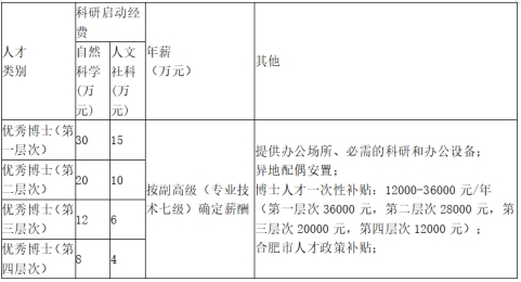 學校根據具體情況采取“一才一議”“一人一策”模式,按照雙方協(xié)商簽訂的協(xié)議對引進人才進行管理。引進的人才入合肥市事業(yè)單位編制,除了享受正常工資福利待遇外,學校還提供住房補貼和科研啟動經費等待遇,具體見下表: