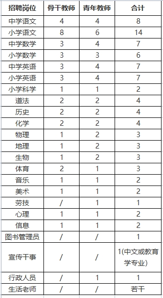 現(xiàn)根據(jù)學(xué)生規(guī)模,面向社會(huì)、全國(guó)師范類院校和一流高校誠(chéng)聘初中、小學(xué)教師若干名,歡迎您加入我們!具體招聘學(xué)科、崗位及數(shù)量如下: