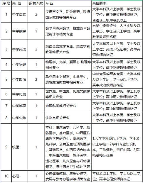 招聘范圍:招聘年齡35周歲以下(截至到報名日期),大學本科及以上學歷、學士及以上學位,具有高中對應學科教師資格證書。教育教學經驗豐富、有突出業(yè)績者年齡可適當放寬到40歲。