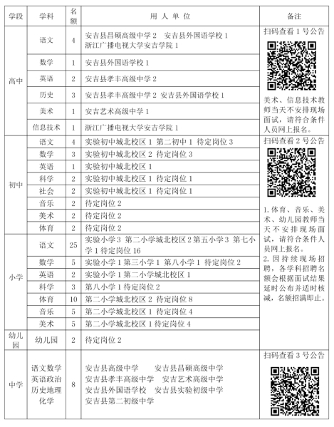 2.詳情請掃碼查詢《浙江省安吉縣招聘2023年教師公告(第1號)》《浙江省安吉縣招聘2023年教師公告(第2號)》《浙江省安吉縣招聘2023年教師公告(第3號)》。