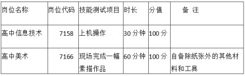 ②高中信息技術(shù)、高中美術(shù)崗位考核由面試、試教、技能測試組成,其他崗位考核由面試、試教組成。面試、試教、技能測試滿分均為100分。面試、試教時(shí)長共10鐘,準(zhǔn)備時(shí)長共40鐘。高中信息技術(shù)、高中美術(shù)崗位的技能測試辦法見下表: