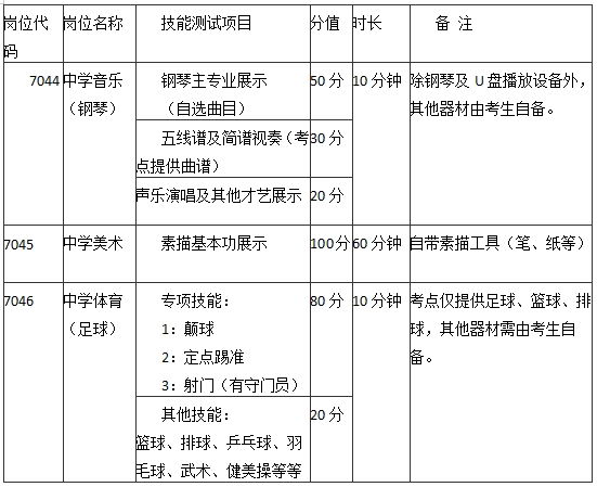 ②7044、7045、7046崗位考核由面試、試教、技能測試組成,其他崗位考核由面試、試教組成,面試、試教、技能測試滿分均為100分。面試、試教時長共10分鐘,準備時長共30分鐘。技能測試辦法見下表: