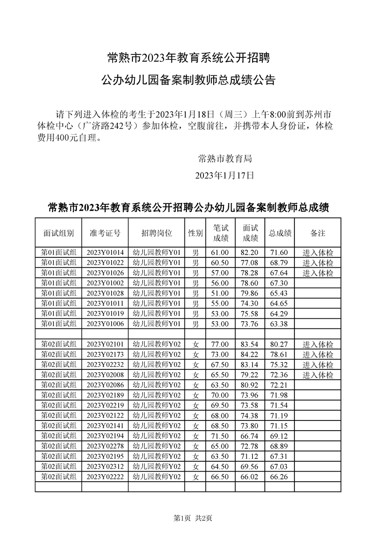 常熟市2023年教育系統(tǒng)公開招聘公辦幼兒園備案制教師總成績公告