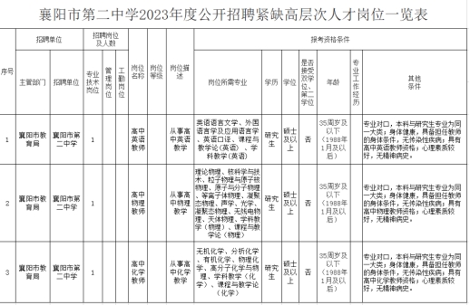 根據(jù)《襄陽市第二中學(xué)2023年度市直事業(yè)單位高層次人才公開招聘方案》要求,經(jīng)學(xué)校研究決定面向社會公開招聘高層次人才教師,公告如下: