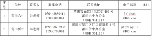 本次報名采取網(wǎng)上報名的形式進行。應(yīng)聘者需提供《莆田市涵江區(qū)考核招聘2023年新任教師報名表》(附件1)、身份證、畢業(yè)證書(應(yīng)屆畢業(yè)生尚未領(lǐng)取的提供畢業(yè)生就業(yè)推薦表)、教師資格證書、普通話等級證書等復(fù)印件各一份,福建省內(nèi)本科高校2023屆優(yōu)秀師范畢業(yè)生(本專業(yè)綜合評價前20%)和福建省內(nèi)本科高校中通過二級認證師范專業(yè)的2023屆優(yōu)秀畢業(yè)生(本專業(yè)綜合評價前30%)還需提供本人專業(yè)綜合評價排名相關(guān)證明材料,郵寄到相關(guān)學(xué)校辦公室或?qū)⒉牧蠏呙杓娮痈灏l(fā)送到相關(guān)學(xué)校郵箱,具體聯(lián)系方式如下: