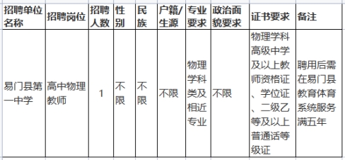 按照《云南省事業(yè)單位公開(kāi)招聘工作人員辦法》(云人社發(fā)〔2016〕182號(hào))等有關(guān)文件規(guī)定,根據(jù)工作需要,易門(mén)縣教育體育系統(tǒng)2023年計(jì)劃提前招聘高中物理教師1名,現(xiàn)將有關(guān)招聘事宜公告如下: