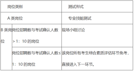 3.綜合素質(zhì)評(píng)估主要采取專(zhuān)業(yè)技能測(cè)試、小組討論等形式對(duì)考生進(jìn)行考察。各崗位具體考核形式見(jiàn)下表。