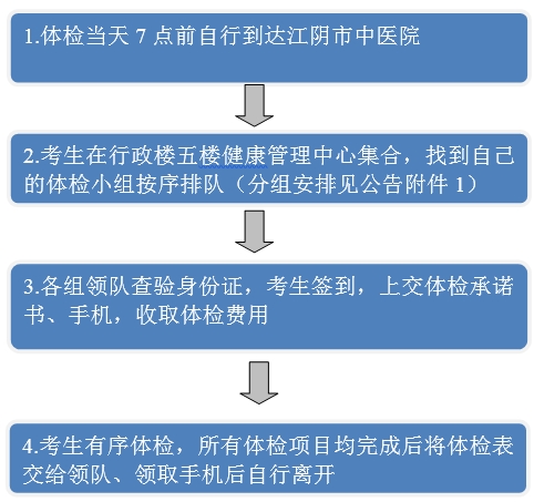 1、請(qǐng)考生帶好身份證原件(其余證件一律無效)、體檢承諾書(見附件2,請(qǐng)預(yù)先下載填寫好)于體檢當(dāng)天早上7:00前到江陰市中醫(yī)院(人民中路130號(hào),公交6路、8路、9路、10路、15路等到中山站下車向東步行100米左右)行政樓五樓健康管理中心集合。體檢費(fèi)由考生自理(550元,收取現(xiàn)金,請(qǐng)自備零錢)。逾期未到者,作自動(dòng)放棄處理。