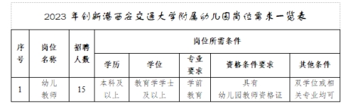 此次招聘幼兒教師15人。具體見《2023年創(chuàng)新港西安交通大學(xué)附屬幼兒園崗位需求一覽表》。