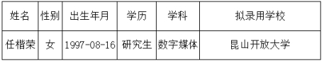 根據(jù)《2022年昆山市教育系統(tǒng)公開(kāi)選聘高層次人才公告》,任楷榮(人員信息附后)已通過(guò)昆山市教育局組織的筆試、面試、體檢(因懷孕緩檢)和考察,現(xiàn)進(jìn)行錄用公示,公示時(shí)間為2023年2月9日~2月17日。如對(duì)公示對(duì)象有異議,可在公示期間向昆山市教育局反映,聯(lián)系電話:57553129。
