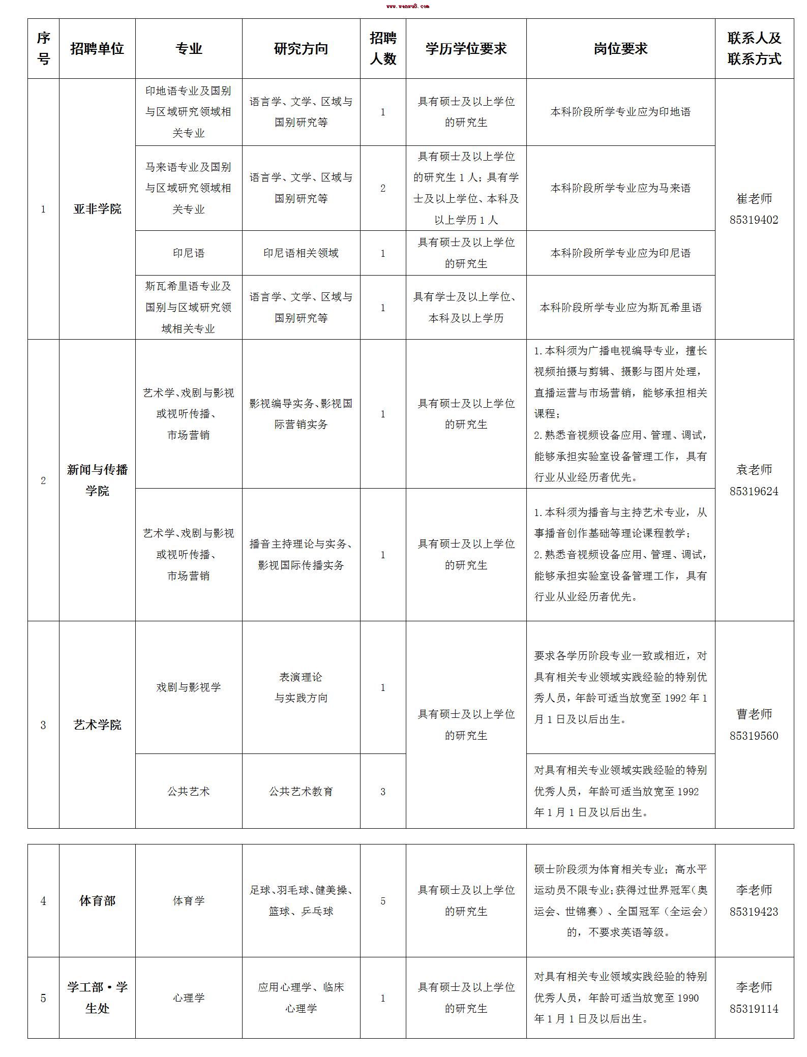 為滿足學校事業(yè)發(fā)展需要,依據(jù)《事業(yè)單位人事管理條例》《陜西省事業(yè)單位公開招聘工作人員實施辦法》《西安外國語大學公開招聘工作人員實施辦法》及有關(guān)規(guī)定,經(jīng)學校研究,現(xiàn)面向社會公開招聘專任教師崗位人員17人,現(xiàn)將有關(guān)事宜公告如下: