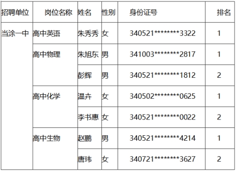根據(jù)《當(dāng)涂一中2023年校園招聘公告》要求,按面試成績(jī)從高到低排序,以招聘人數(shù)與崗位數(shù)1:1的比例確定體檢對(duì)象。具體名單如下: