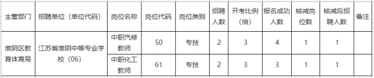 2023年淮安市淮陰區(qū)公開招聘教師報(bào)名工作已結(jié)束。因部分崗位(詳見(jiàn)下表)符合報(bào)名條件人數(shù)未達(dá)到《2023年淮安市淮陰區(qū)公開招聘教師公告》規(guī)定的開考比例,現(xiàn)根據(jù)《2023年淮安市淮陰區(qū)公開招聘教師公告》的規(guī)定,對(duì)未達(dá)到開考比例的崗位招聘計(jì)劃進(jìn)行核減,F(xiàn)將崗位核減計(jì)劃公告如下: