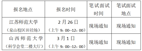 本次招聘在江蘇師范大學(xué)(泉山校區(qū))、山西師范大學(xué)等地設(shè)招聘點,采取現(xiàn)場報名的方式,所有到現(xiàn)場報考人員及時了解并嚴(yán)格遵守當(dāng)?shù)匾咔榉揽毓ぷ饕螅鲃优浜喜⒆杂X服從考試管理機(jī)構(gòu)的相關(guān)安排,做好個人安全防護(hù)。