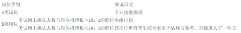 綜合素質(zhì)評估主要采取專業(yè)技能測試、小組集體討論等形式,對考生進行考察。有關(guān)崗位分類見附件1需求表,各崗位具體考核形式見下表。