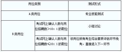 綜合素質(zhì)評估主要采取專業(yè)技能測試、小組集體討論等形式,對考生進行考察。有關(guān)崗位分類見附件1需求表,各崗位具體考核形式見下表。