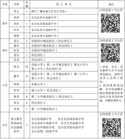 2.詳情請掃碼查詢《浙江省安吉縣招聘2023年教師公告(第1號)》《浙江省安吉縣招聘2023年教師公告(第2號)》《浙江省安吉縣招聘2023年教師公告(第3號)》。