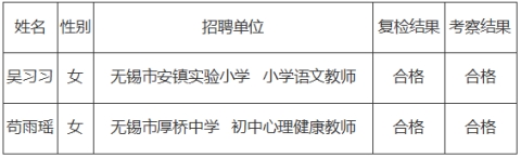 根據(jù)《無(wú)錫市錫山區(qū)教育系統(tǒng)面向2023屆全日制普通高校應(yīng)屆畢業(yè)生公開招聘事業(yè)編制教師公告》(錫人社事招公告核[2022]68號(hào))規(guī)定,現(xiàn)將無(wú)錫市錫山區(qū)教育系統(tǒng)面向2023屆全日制普通高校應(yīng)屆畢業(yè)生公開招聘事業(yè)編制教師(華中師范大學(xué)考點(diǎn))體檢復(fù)檢和考察結(jié)果進(jìn)行公告,名單如下: