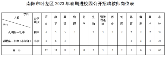 進(jìn)校園公開招聘教師60名。具體崗位詳見《南陽市臥龍區(qū)2023年春期進(jìn)校園招聘教師崗位表》(見附件1)。