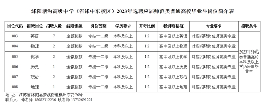 因教育事業(yè)發(fā)展需要,經(jīng)沭陽縣委、縣政府批準,沭陽塘溝高級中學(江蘇省沭陽高級中學東校區(qū))面向高校公開招聘在編教師15名,F(xiàn)將有關(guān)事項公告如下: