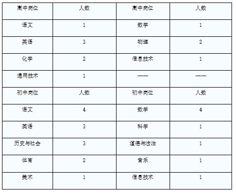 根據(jù)學(xué)校高中部事業(yè)發(fā)展需要和上級關(guān)于義務(wù)教育民辦學(xué)校轉(zhuǎn)公辦的相關(guān)工作要求,經(jīng)研究,決定公開招聘鎮(zhèn)海中學(xué)臺州分校高中教師11名、初中教師21名,F(xiàn)將相關(guān)事項公告如下: