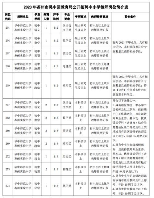 1.吳中區(qū)教育人才引進:語文、數學、英語、物理、化學、生物、政治、歷史、地理、體育若干名(見后續(xù)公告)。