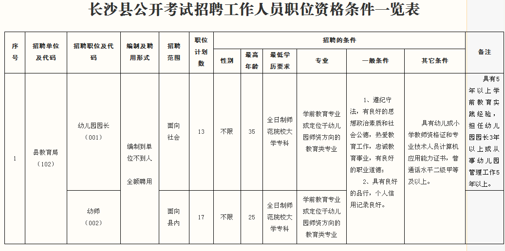 長沙縣公開考試招聘工作人員職位資格條件一覽表