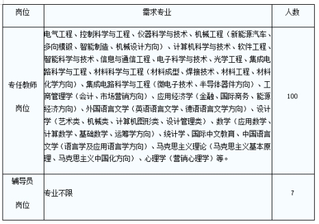招聘專任教師100人(事業(yè)編制),從事教學和科研工作;招聘輔導員7人(事業(yè)編制)。