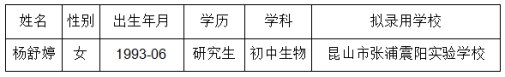 根據(jù)《2022年昆山市教育系統(tǒng)公開(kāi)招聘中小學(xué)教師簡(jiǎn)章》,楊舒婷(人員信息附后)已通過(guò)昆山市教育局組織的筆試、面試、體檢(因懷孕緩檢)和考察,現(xiàn)進(jìn)行錄用公示,公示時(shí)間為2023年3月30日~4月7日。如對(duì)公示對(duì)象有異議,可在公示期間向昆山市教育局反映,聯(lián)系電話:57553129。