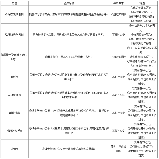 弘深杰出學(xué)者崗、弘深優(yōu)秀學(xué)者崗、弘深青年學(xué)者崗;教授崗、準聘教授崗、副教授崗、準聘副教授崗、講師崗。
