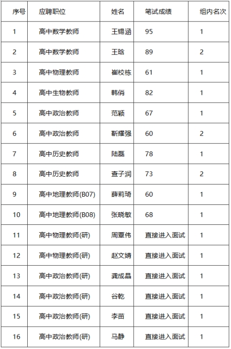根據(jù)《響水縣灌江高級(jí)中學(xué)》精神,經(jīng)筆試,現(xiàn)將響水縣灌江高級(jí)中學(xué)2023年赴山西師范大學(xué)校園招聘教師擬進(jìn)入面試人員成績(jī)及名單予以公布。