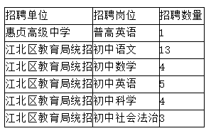 根據(jù)《寧波市事業(yè)單位公開招聘工作人員實(shí)施辦法》(甬政發(fā)〔2007〕109號)、《關(guān)于進(jìn)一步貫徹落實(shí)〈寧波市事業(yè)單位公開招聘工作人員實(shí)施辦法〉的意見》(甬人社發(fā)〔2012〕180號)和《江北區(qū)事業(yè)單位工作人員陽光招錄實(shí)施辦法》(北區(qū)委辦〔2013〕75號)的有關(guān)規(guī)定,結(jié)合江北區(qū)教育事業(yè)發(fā)展的需要,寧波市江北區(qū)決定面向社會公開招聘事業(yè)編制教師45名,其中惠貞高中7名,義務(wù)段38名,現(xiàn)就有關(guān)事項(xiàng)公告如下: